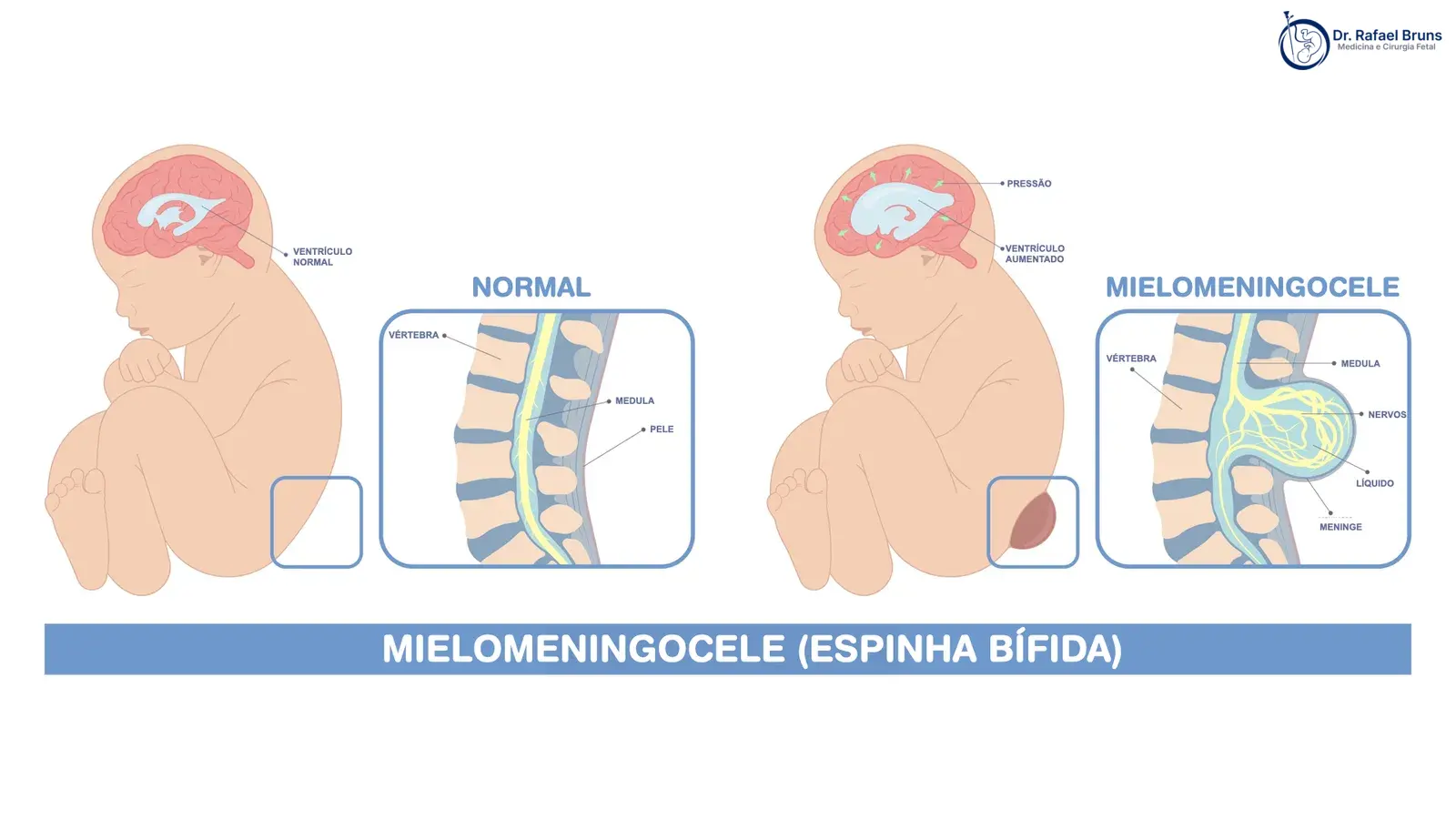 A mielomeningocele é uma malformação congênita da coluna vertebral causada pelo fechamento incompleto do tubo neural. O diagnóstico pré-natal permite planejar o tratamento — que pode incluir cirurgia fetal em casos selecionados — e organizar o cuidado multidisciplinar desde antes do nascimento.